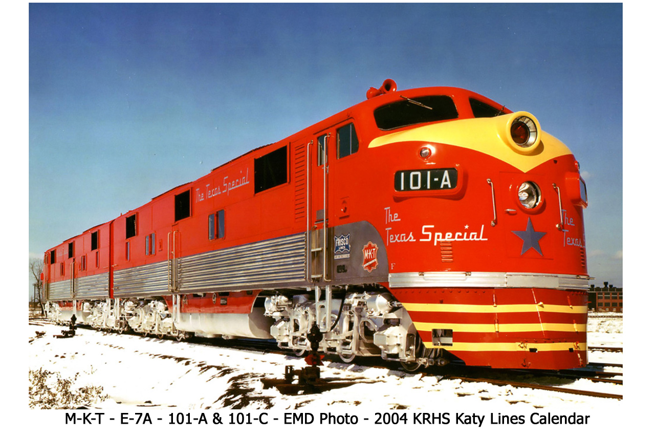 The first passenger units ordered would be the EMD E-7 units for the streamlined Texas Special train in March of 1947. These were painted Cardinal Red with silver lower side panels. The upper surface of the nose forward of the windshield was painted cream yellow and the red enameled steel M-K-T shield was placed on the sides of the new diesel locomotives. More passenger units were ordered from Alco in 1949, these were the 2000 hp Alco PA1 numbered 151A and 151C. These were painted with faded stripes to simulate the stainless steel corrugated sides on the streamlined Texas Special passenger cars. All covered wagon locomotive types would carry a similar paint scheme. Later GP-7 and other hood type freight locomotives had cream yellow safety stripes front and rear.The Katy would eventually order engines from all the major locomotive manufacturers, this created a nightmare for the Katy shop forces. All but a few engines would be rebuilt and re-engined from the frame up with EMD hoods and engines. Starting in 1957 with the railroad in dire financial straits William Derumas era began with the M-K-T shield and locomotive paint scheme changing. Locomotives were painted a slightly darker shade of red without the safety stripes, silver sides or cream yellow nose and a new gold herald with red KATY in the center. With the railroad close to bankruptcy John W. Barriger was elected to save the railroad. The classic M-K-T herald shape was brought back and the main color returned to red. The banner and palm leaves from the previous M-K-T herald returned with the KATY retained. With the railroad on the road back to financial health the Reginald N. Whitman era of John Deere green and yellow started in 1972 and remained until the 1988 merger with the Union Pacific.