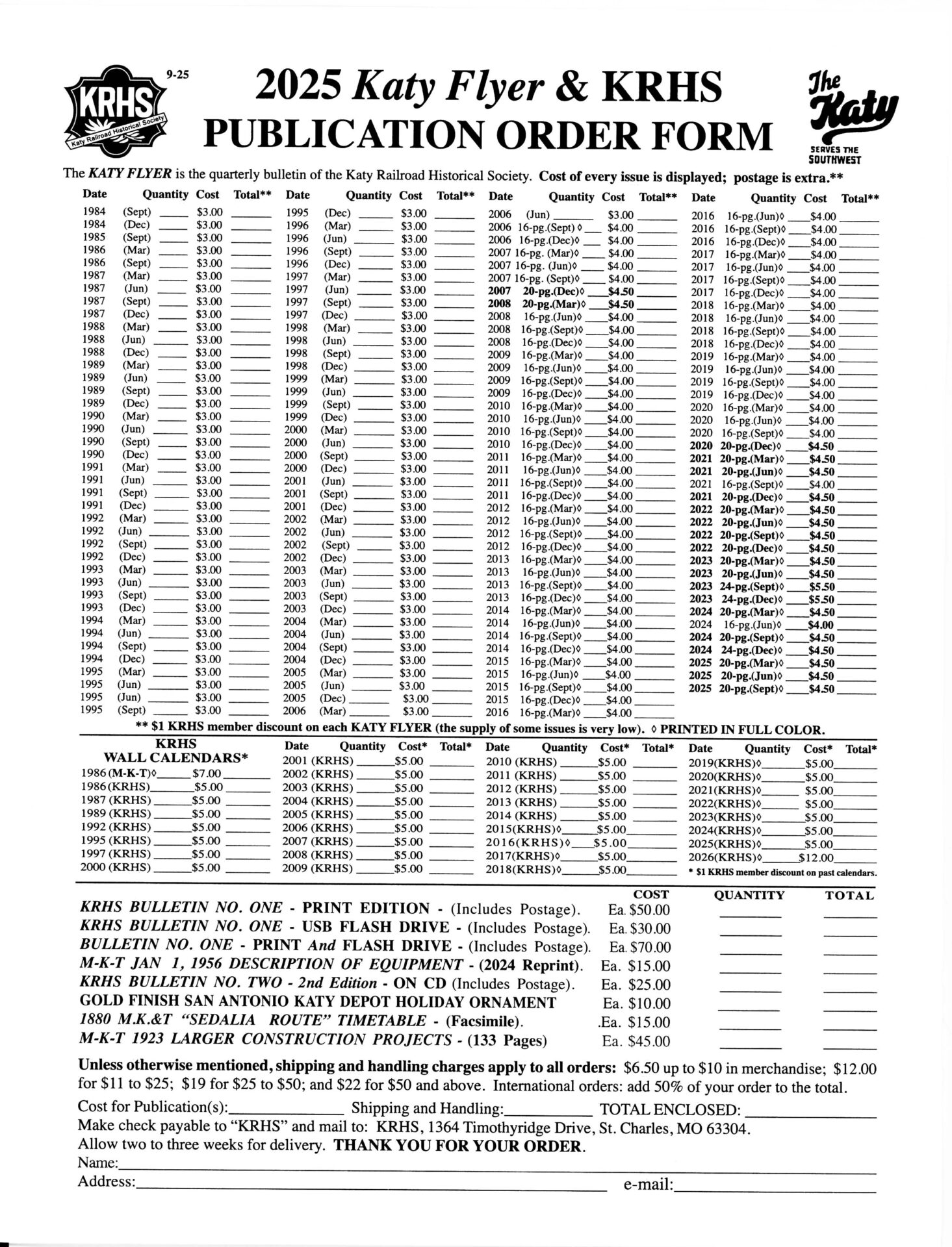 KRHS Katy Flyer Magazines and Calendars feature many rare and historic photographs of the Katy Railroad that are great for collecting and research.