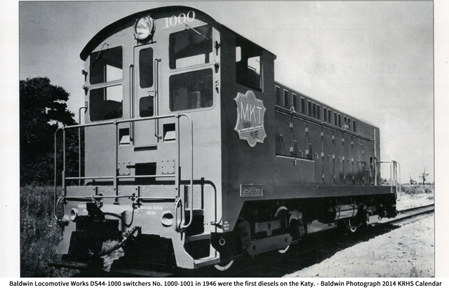 The Katy began phasing out the steam engine when General Motors / EMD A-B-B-A demonstrator set No. 291 made testing runs from Houston to St. Louis in 1946. After 10 days of rigorous testing the Katy placed their first diesel order for 6 Baldwin DS4-4-1000 switch engines. These would replace an aging steam switcher fleet in the Dallas yard. These units were numbered 1000 – 1005 and delivered in a solid gray paint scheme with an MKT herald on each side of the cab. The following year two more orders were placed, five GM / EMD NW2 switchers and five more Baldwin DS4-4-1000’s. These 1000 horsepower switchers would be used to further dieselize yard operations throughout the system. All would have black and white stripes added to the front hood and rear of the cab in an effort to make them more visible at grade crossings.