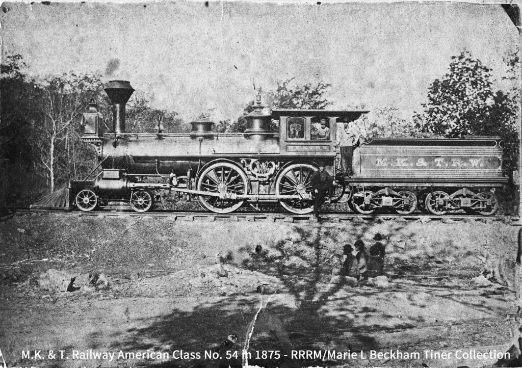 When the Katy started building its line to the Gulf of Mexico in Texas in 1870 the early engines were typical for the time period. Mostly diamond stack 4-4-0 American types with a few 2-6-0 Moguls on the roster. According to photos and interviews with long time employees these engines had a polished boiler jacket, probably Russian Iron green or dark maroon with a dark graphite smoke box, stack and glossy black cab. All passenger engines were finished in gold lettering and striping.A large oval medallion on the side and back of the tender, with a field of Chinese vermillion and company initials M. K. & T. R. W. inside of the oval and on the side of the crew cab. The number of the engine in the center of a field of gold, black shaded and split on the rear of the tender of the tender.